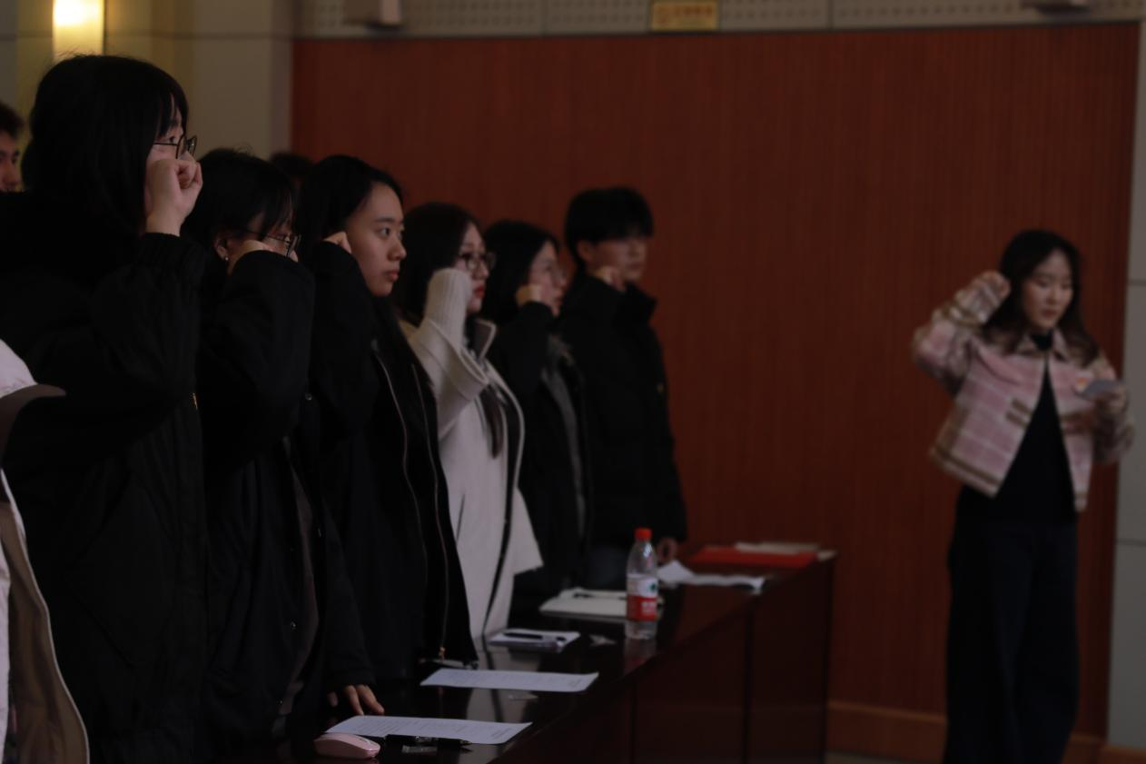 新党员同志郑重佩戴党员徽章。熠熠生辉的党员徽章佩戴于左胸,既是荣誉的象征,更是责任的嘱托。随后,在党员代表张怡雪的带领下,全体宣誓人面向鲜红党旗,举起右拳,庄严宣读入党誓词。铮铮誓言响彻会场,字字千钧映照初心,既是对党组织的郑重承诺,更是融入血脉的信仰宣言。