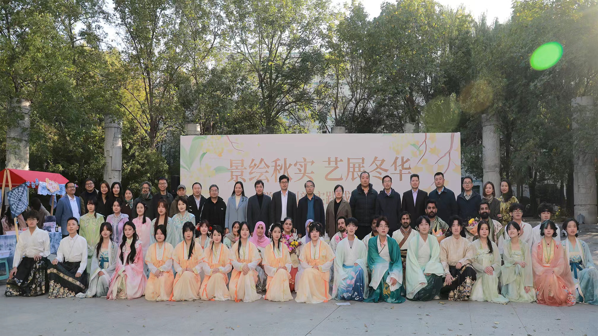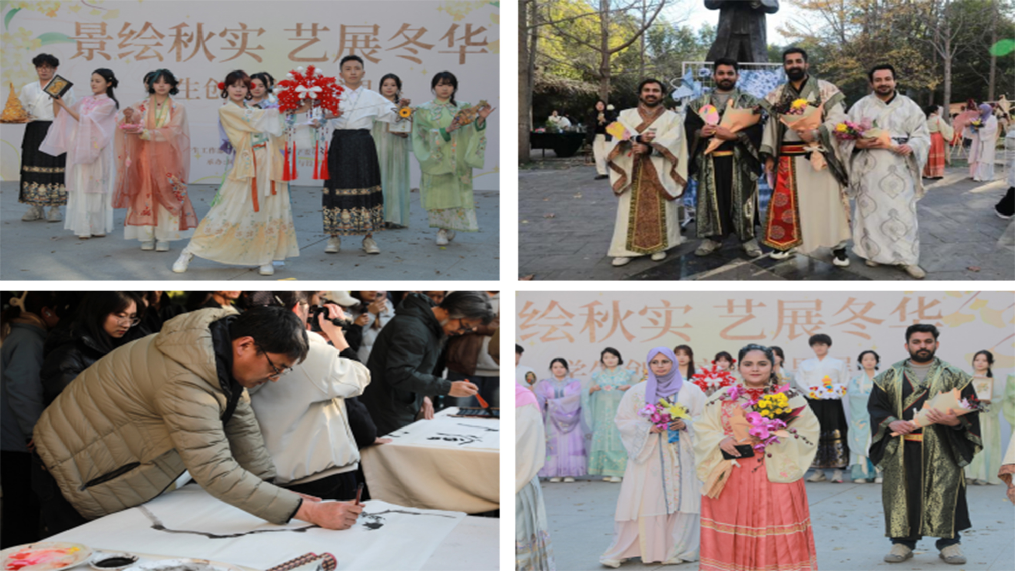 活动在两院学子《上春山》《上铃鼓》的表演中拉开序幕,中外学子共同呈现的走秀《金扇辞秋》瞬间点燃全场,生动诠释了文化交流融合之美。