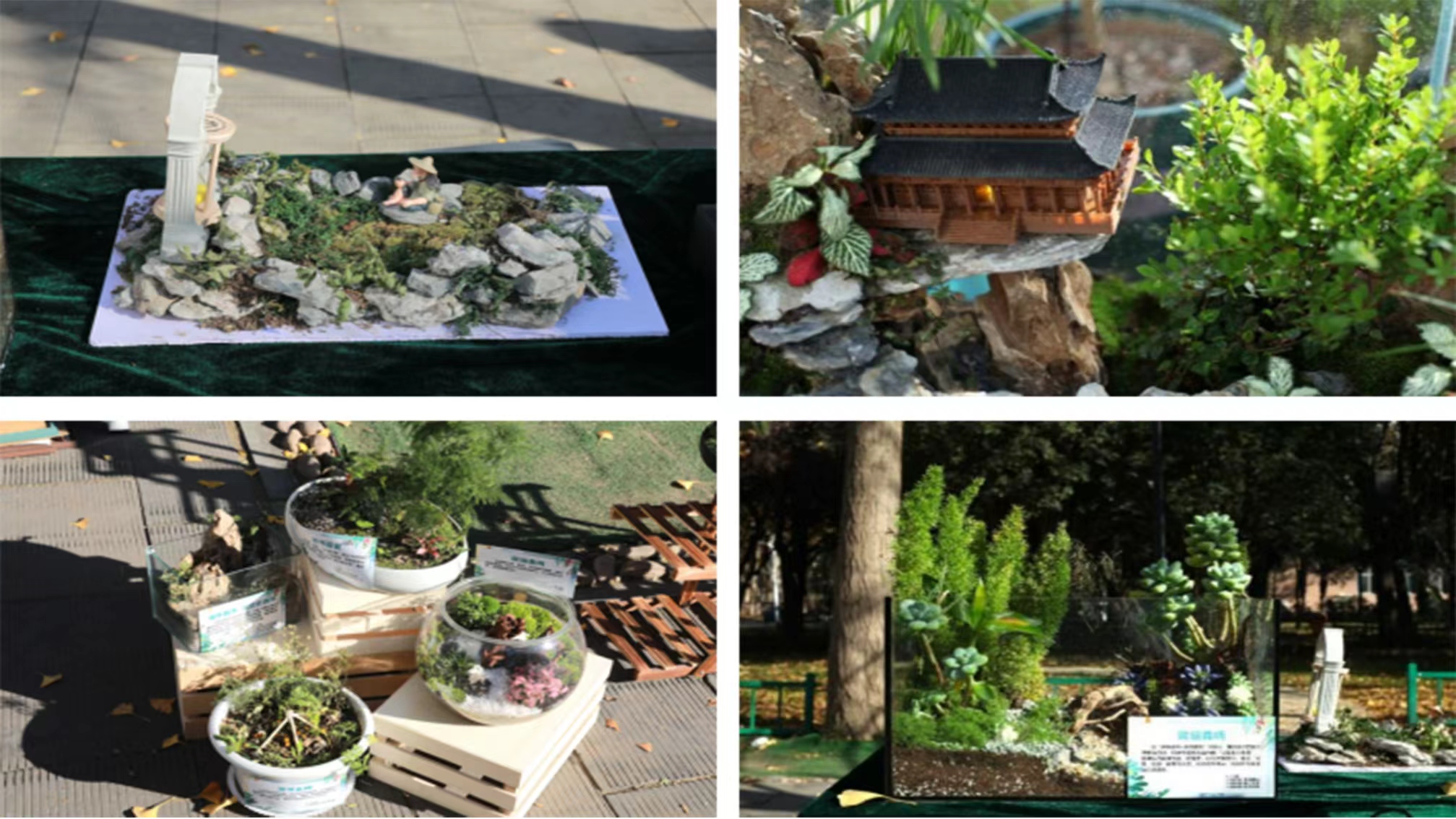 成果展共设置了“书画创作区”“生态微景观区”“美陈装置区”“游戏互动区”“手工艺品展示区”五个区域。书画创作区以秋为题,现场挥毫中华传统书画,笔力苍劲,写意含蕴;生态微景观区50余组生态瓶将园林山水浓缩于方寸之间,叠石映水皆成趣,草木缀景尽含灵;美陈装置区巧妙结合传统纸伞、竹编工艺与现代花艺设计,诠释自然材质与艺术设计的共生之美;游戏互动区于投壶的雅趣、漆扇的雅致、滴胶的巧思中铺展中华传统文化肌理,尽显中式美学的独特魅力;手工艺品展示区非遗绒花头饰尽显雅致,掐丝珐琅镜还原饰添巧思,融合传统与创意。五大区域各有特色,共同勾勒出一场兼具文化底蕴与创意活力的成果盛宴。